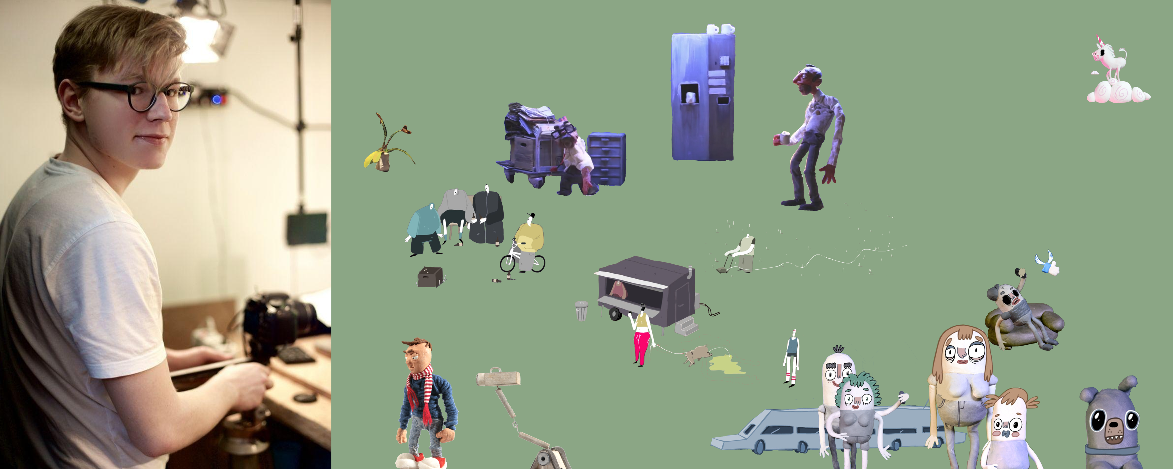 In my youth up until 2017 I created multiple animated films (in 2D, Stop-Motion and in mixed techniques). In the image above you can see the characters of four of the films: “Watched” (2014), “Likeable” (2015), “Leute” (“People”, 2015) and “Drei” (“Three”, 2017).
